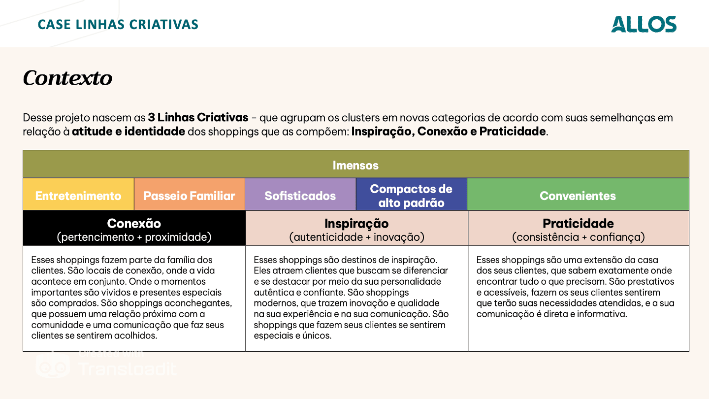 A resposta surgiu de um caminho inovador para o setor. Em vez de marcas independentes ou uma estrutura única, criamos três linhas criativas distintas: Conexão, Inspiração e Praticidade. Cada linha atende a grupos específicos de shoppings com características similares, oferecendo diretrizes completas de identidade verbal e visual – da tipografia às cores, dos grafismos ao tom de voz.