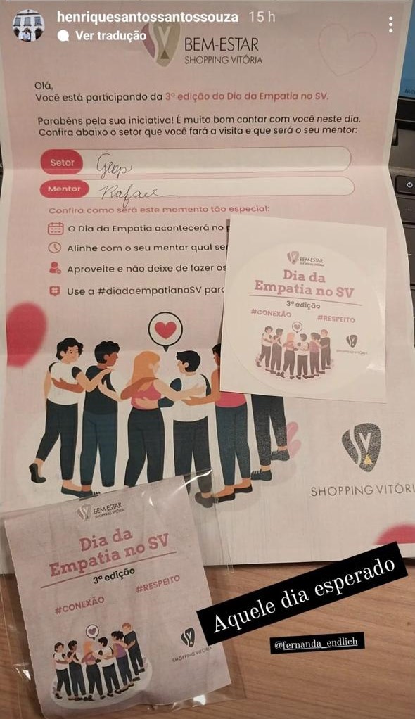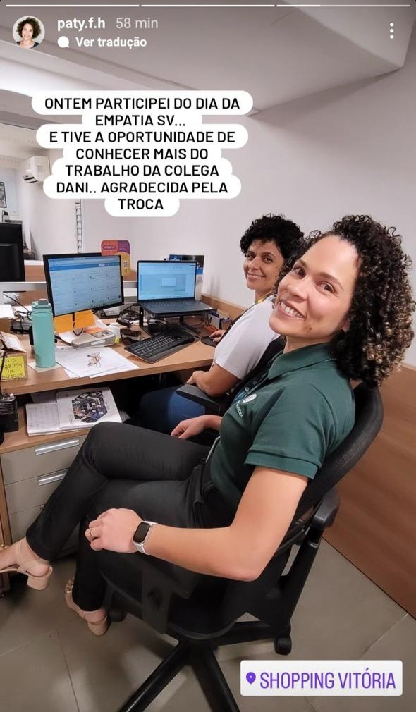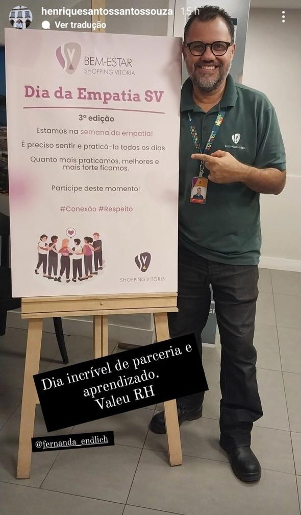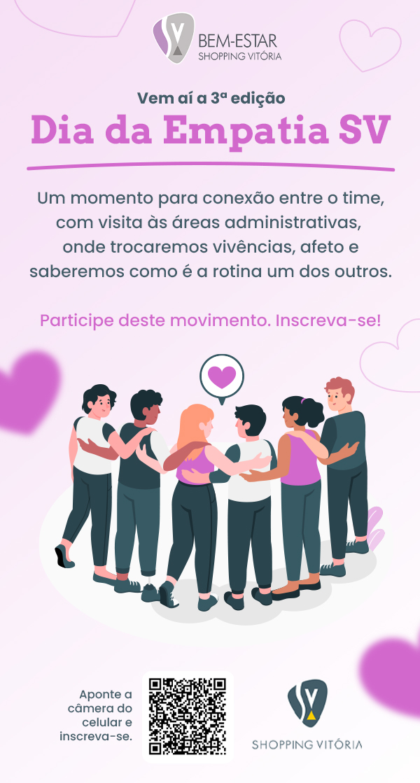 No Shopping Vitória, acreditamos que colocar as pessoas no centro é o ponto de partida para um ambiente de trabalho saudável, produtivo e humano. Foi com esse propósito que criamos o Dia da Empatia SV, reforçando nosso compromisso com uma cultura acolhedora, onde o diálogo é constante e o respeito é a base de tudo. Ambientes mais humanos geram conexões verdadeiras e são essas conexões que impulsionam o crescimento do negócio. Acreditamos que a gestão de pessoas vai além de processos e metas, ao promover uma cultura de empatia e cooperação como prática diária. Em 2024, o Dia da Empatia SV chegou à sua terceira edição, marcando o Dia Mundial da Empatia (12 de junho) com duração de uma semana. Os colaboradores das áreas administrativas, de segurança e operação trocaram de funções por um dia, exercitando a escuta ativa e compreendendo melhor o papel do outro. A empatia conecta, engaja e fortalece o nosso time.