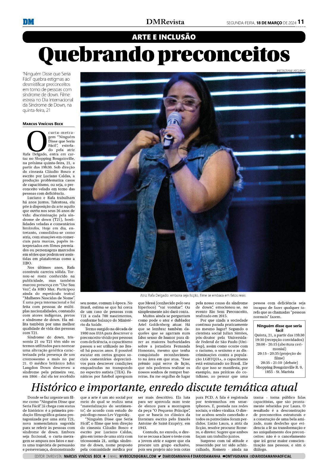 No Dia Mundial da Síndrome de Down, o Shopping Bougainville promoveu a exibição do curta-metragem “Ninguém Disse Que Seria Fácil”, protagonizado por Rafa Delgado — a primeira atriz goiana com Síndrome de Down a liderar um filme local. A iniciativa foi um convite à reflexão sobre inclusão, diversidade e representatividade no audiovisual, especialmente em eventos culturais realizados em Goiânia. O projeto teve como propósito sensibilizar, educar e valorizar a pluralidade, atraindo um público diverso ao recém-inaugurado Cinemais. Devido à alta demanda, foi necessário ampliar o número de sessões, superando as expectativas de público. A ação reafirma o compromisso do shopping com causas sociais, acessibilidade e a promoção de debates que integram a arte, a cultura e a realidade cotidiana de forma transformadora.