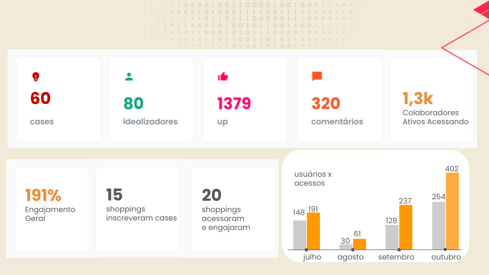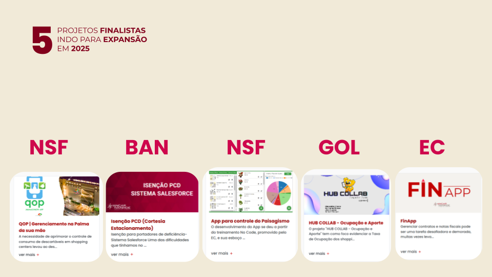 Em 2024, a Maratona do Portal de Inovação mobilizou 15 shoppings, gerando 60 projetos e engajando 1,3 mil colaboradores. Os cinco cases finalistas passaram por curadoria técnica e votação aberta, resultando em premiações e expansão para outros shoppings. Entre os destaques: app de gestão de estoque, automação de isenção de estacionamento PCD e ferramenta de projeção financeira.