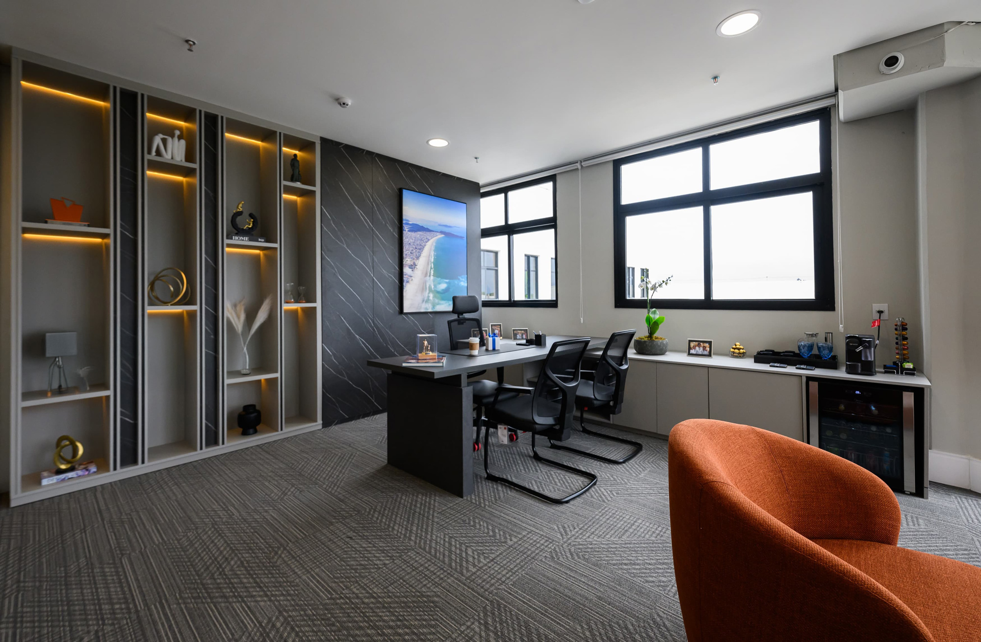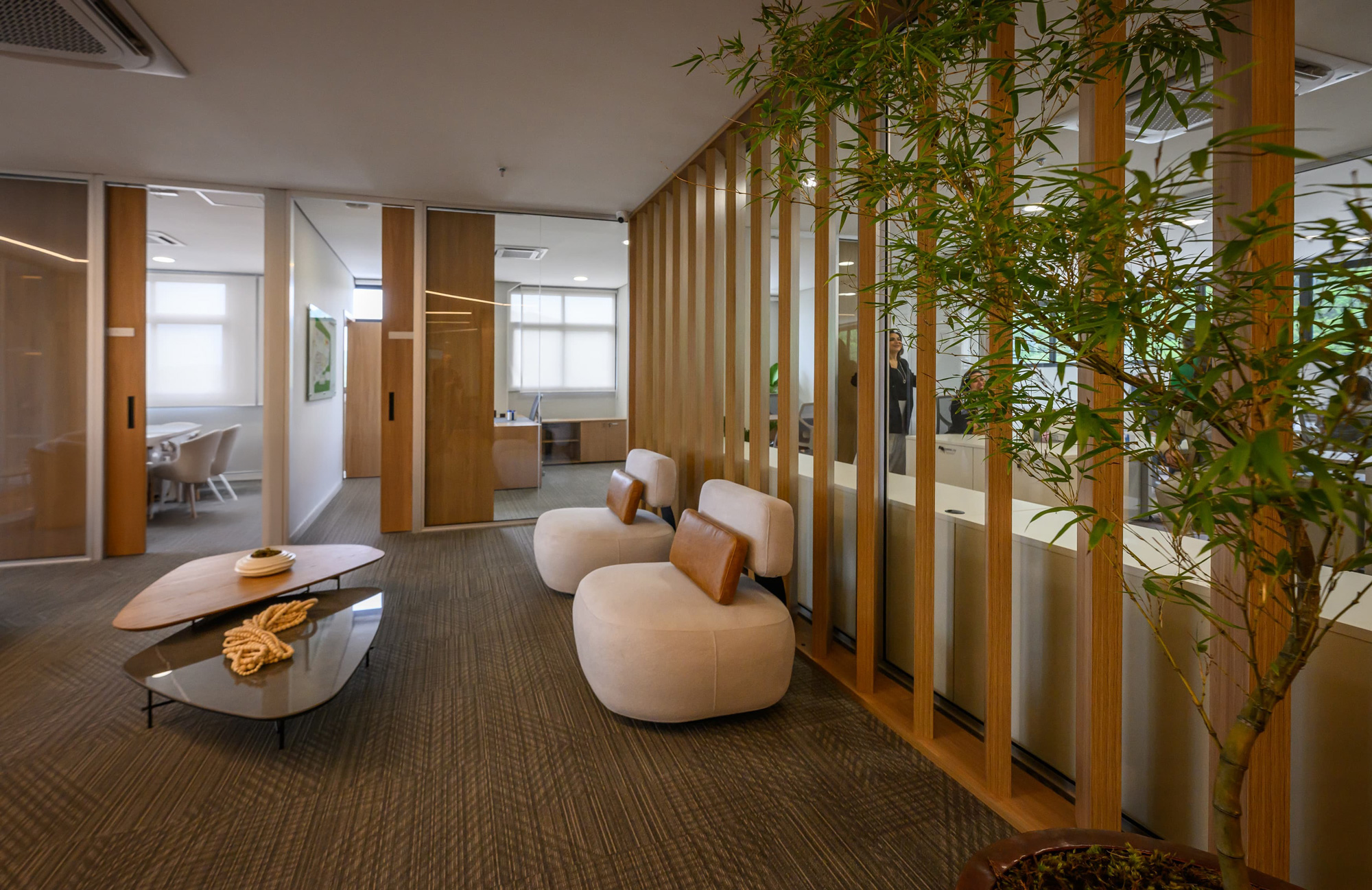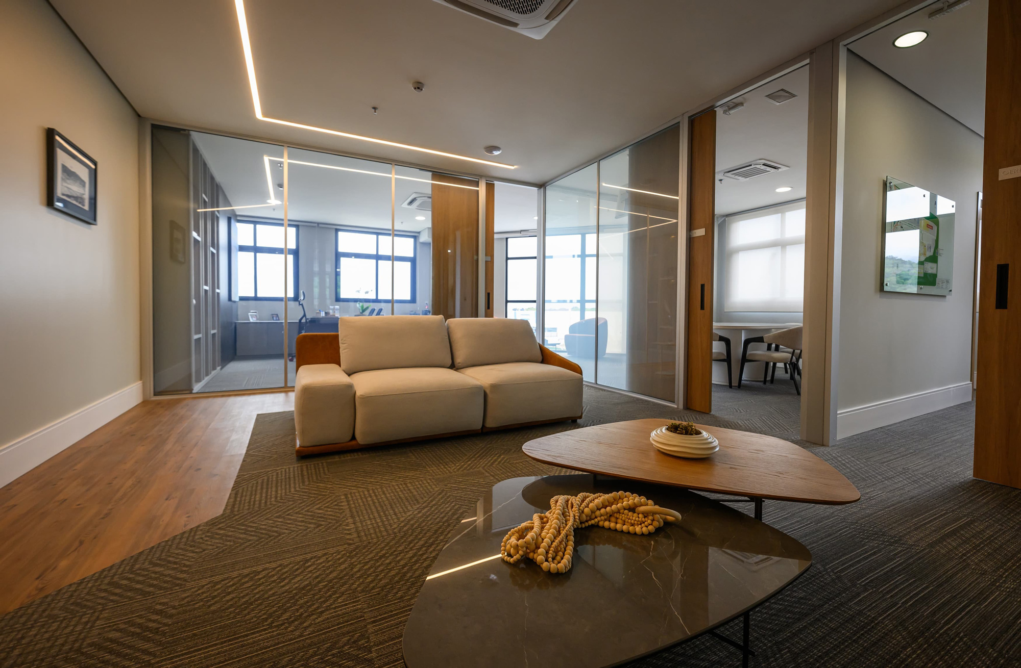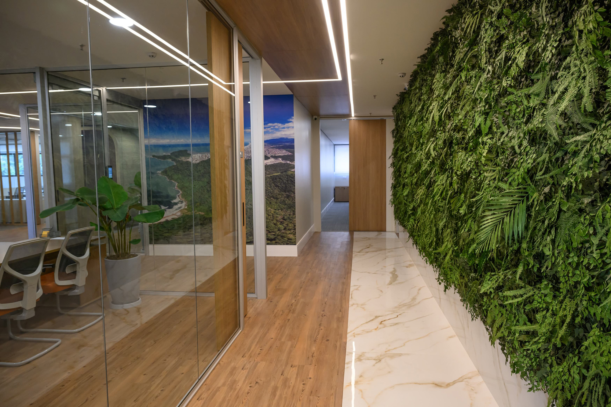 A nova administração do Shopping Litoral Plaza ocupa 500m², projetados com muito carinho para refletir a evolução do shopping e o crescimento de Praia Grande. A escolha do local foi estratégica, oferecendo uma vista ampla e natural, com mata preservada ao redor, criando um ambiente inspirador. O espaço é moderno, acolhedor e tecnológico, com equipes conectadas, mantendo a transparência entre os setores e respeitando as individualidades. Cada detalhe conta a história da família que, vinda de Portugal, construiu o maior empreendimento da cidade. O prédio é equipado com vidros inteligentes, garantindo transparência no dia a dia e privacidade em momentos estratégicos. A copa, projetada para descompressão, oferece um espaço de pausa ou encontros informais com vista incrível. A integração da natureza no ambiente cria uma atmosfera acolhedora, favorecendo o bem-estar e produtividade dos colaboradores. Este projeto é uma celebração da nossa história, das nossas raízes e da visão de futuro