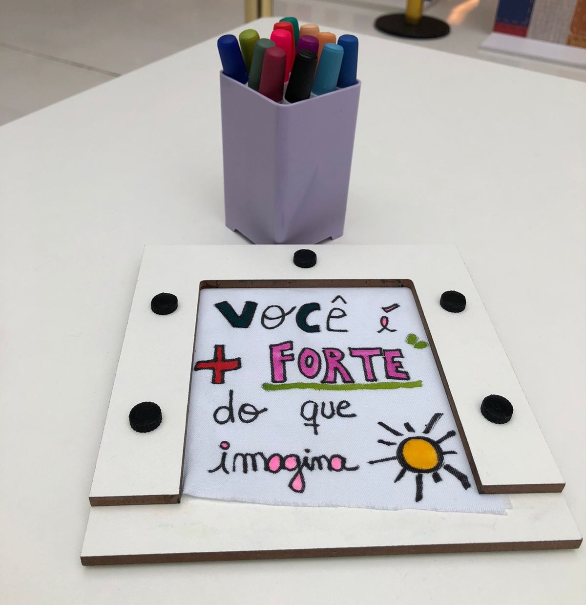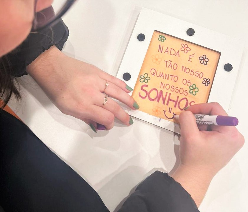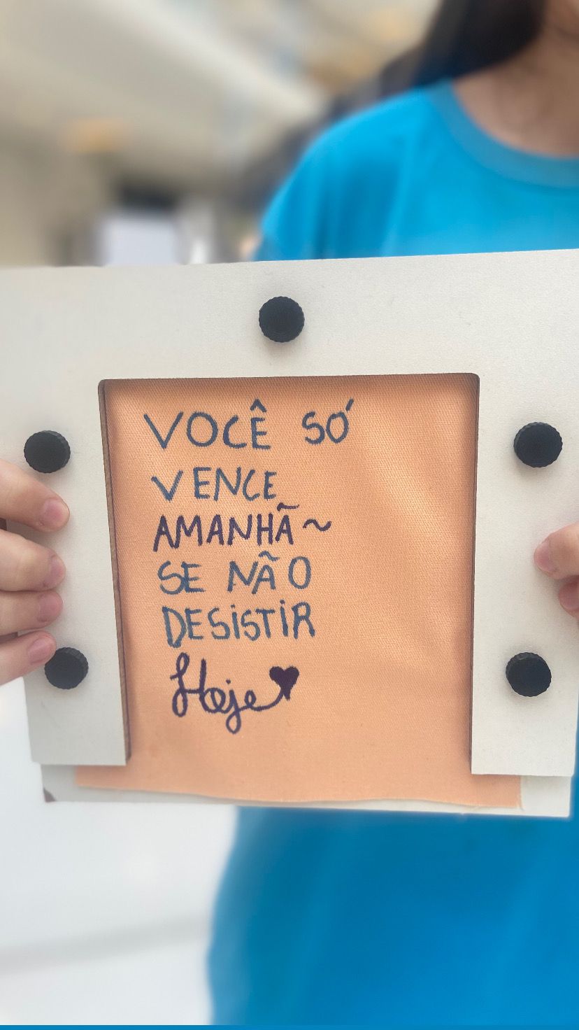 No espaço dedicado à oficina, cada pessoa podia escrever mensagens de apoio e incentivo em quadrados de tecido, que foram costurados em cobertores. Essas peças não apenas ajudaram a aquecer quem enfrentou o frio, mas também carregou palavras de motivação e acolhimento.