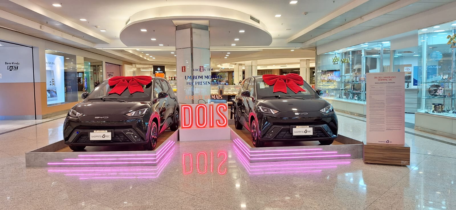 Com o mote “Você já tem um bom motivo para presentear. A gente dá mais dois”, o Shopping ABC inovou no Dia dos Namorados 2024 com uma campanha que uniu emoção, sustentabilidade e desejo de consumo. O destaque foi o sorteio de dois carros elétricos Dolphin Mini Polar, da BYD: um para o ganhador e outro para seu par.