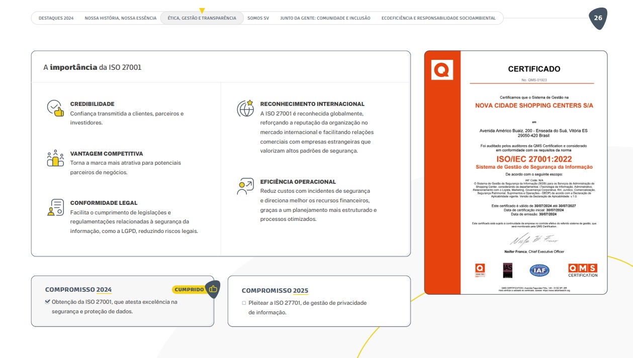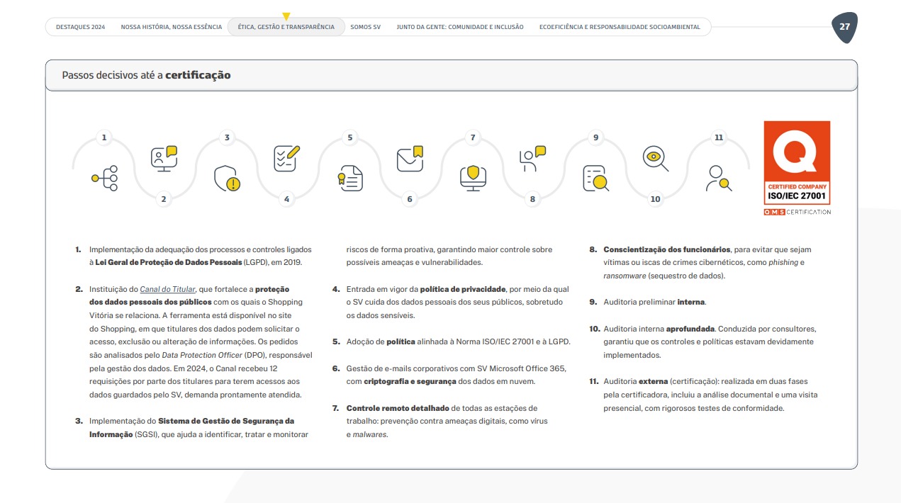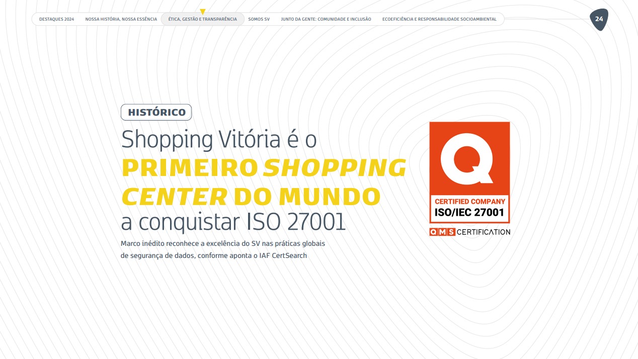 Em 2024, o Shopping Vitória tornou-se o primeiro shopping center do mundo a conquistar a certificação ISO 27001. Um marco histórico que vai muito além da tecnologia: é sobre proteger histórias. Cada cadastro em uma promoção, cada clique em uma campanha envolve dados que agora contam com um nível de proteção internacional. Foram mais de 80 ações executadas, envolvendo equipes, treinamentos e mudanças estruturais para garantir a integridade, a confidencialidade e a disponibilidade das informações de clientes, lojistas, fornecedores e colaboradores. A conquista chancela uma cultura de responsabilidade digital e inspira o setor de shopping center a olhar para a segurança da informação com a mesma seriedade com que se cuida de cada detalhe da experiência de quem passa pelo mall. No Shopping Vitória, proteger dados é proteger pessoas.