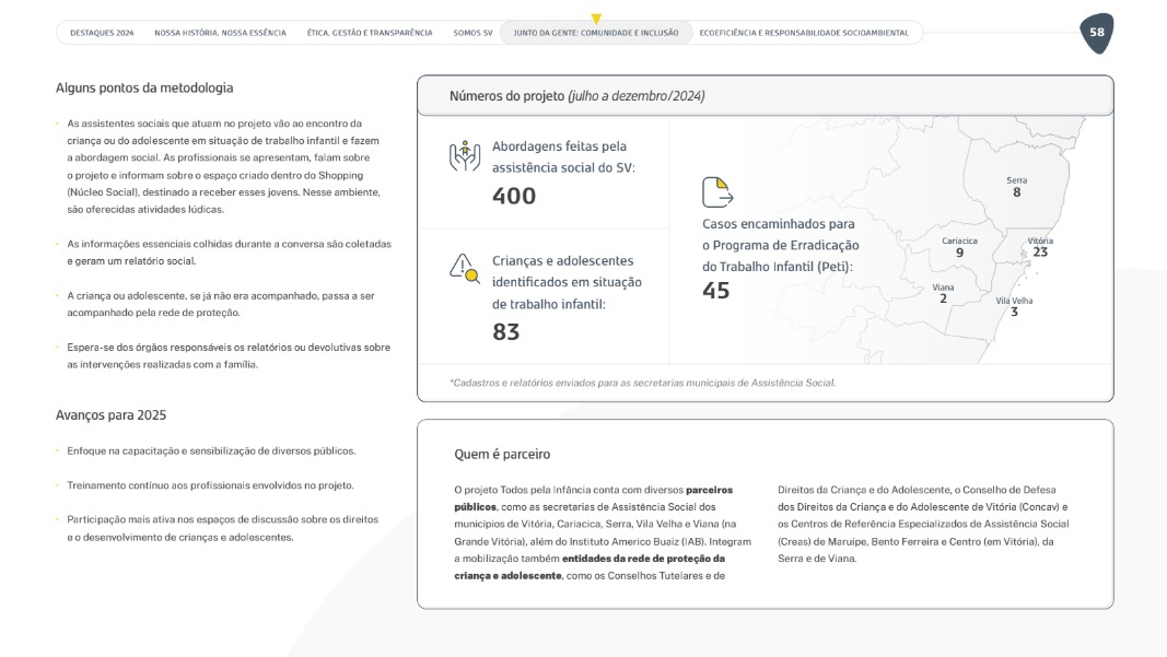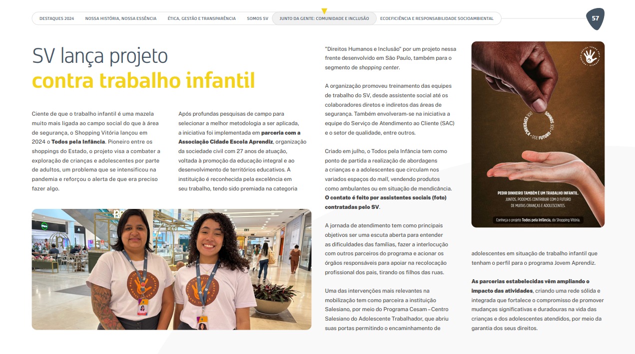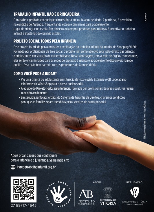 Era uma vez uma realidade que não podia mais ser ignorada. Em meio ao movimento cotidiano do Shopping Vitória, tornou-se visível o impacto silencioso de uma crise social agravada pela pandemia: o aumento do trabalho infantil. Em 2024, decidimos agir. Nasceu o projeto Todos pela Infância, pioneiro no Espírito Santo, com o propósito de proteger crianças e adolescentes em situação de vulnerabilidade. Em parceria com a Associação Cidade Escola Aprendiz, referência nacional em inclusão e direitos humanos, criamos uma rede de acolhimento e transformação. Com atuação direta de assistentes sociais, o projeto promove a escuta ativa, o encaminhamento à rede de proteção e ações que também alcançam os pais — como a inserção em programas de recolocação profissional. Mais do que enfrentar um problema, buscamos mudar histórias.