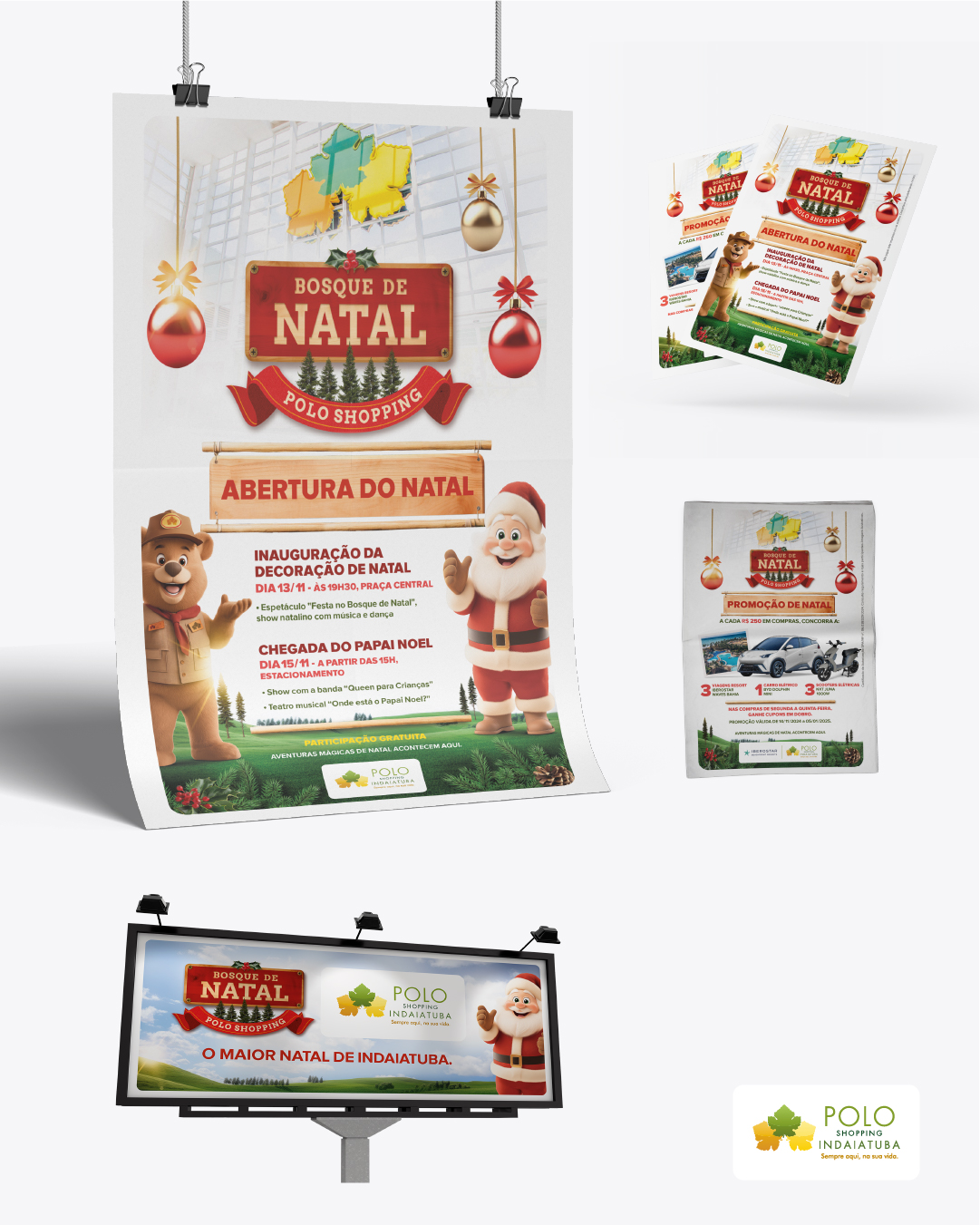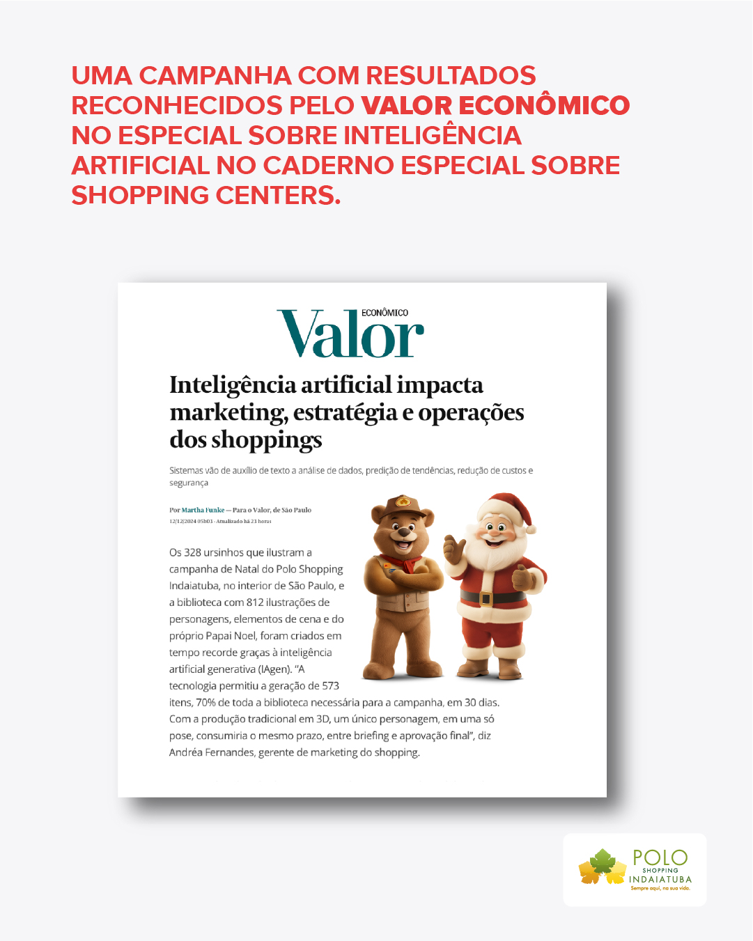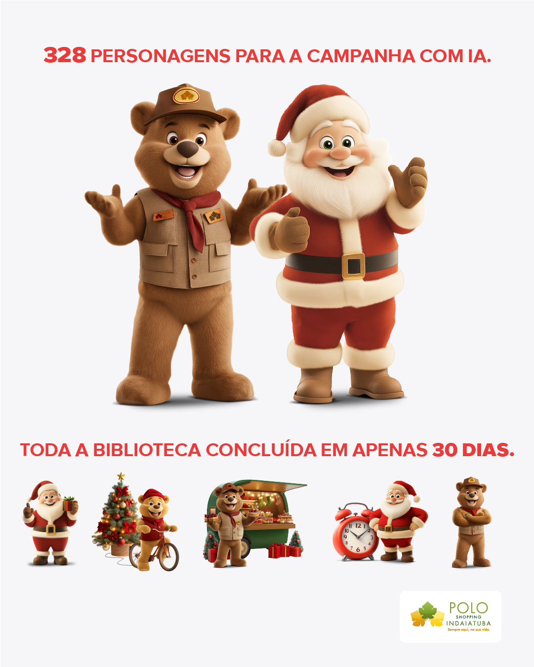 A campanha de Natal 2024 do Polo Shopping Indaiatuba é um case no uso da inteligência artificial aplicada ao marketing. Com base nos elementos da decoração, cujo tema foi “Bosque de Natal”, a IA generativa foi utilizada para criar um personagem principal (um simpático ursinho guardião da floresta) e compor todo o universo visual da campanha. Foram geradas centenas de ilustrações tridimensionais, o que deu agilidade ao processo de criação, possibilitou uma personalização inédita para a campanha e gerou conexão emocional com o público. Pela produção tradicional em 3D, um único personagem levaria até 30 dias para ficar pronto. Com a IA, toda a biblioteca visual foi gerada nesse mesmo tempo. A iniciativa demonstrou como a IA pode ser uma aliada estratégica, sem substituir o olhar humano, que continua essencial nos insights criativos, refinamento dos prompts, curadoria e direção de arte.